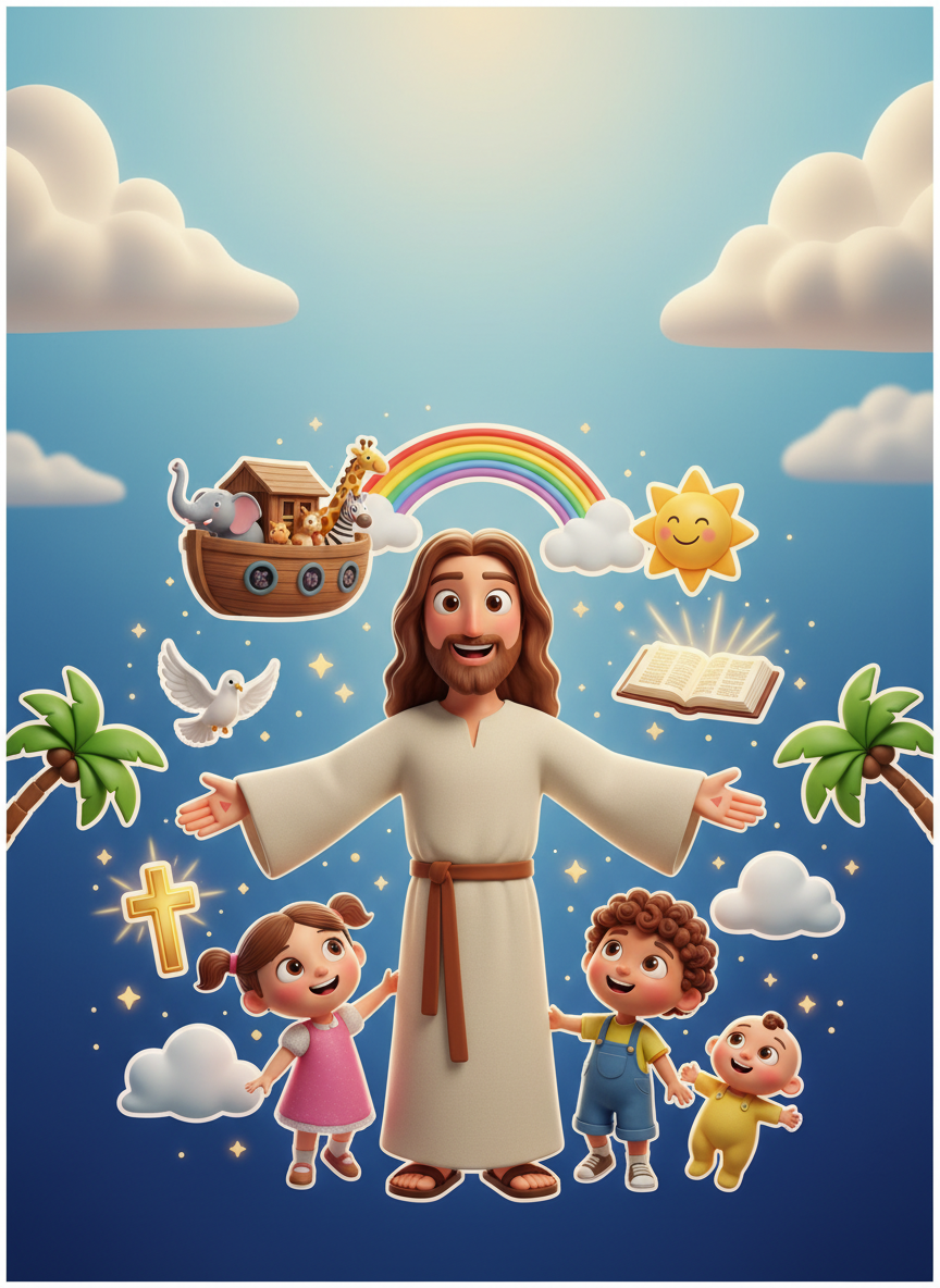 Nada de crucifixão, dilúvio castigo ou sacrifício. Só o lado bonito da fé — do jeito que criança pequena precisa conhecer.